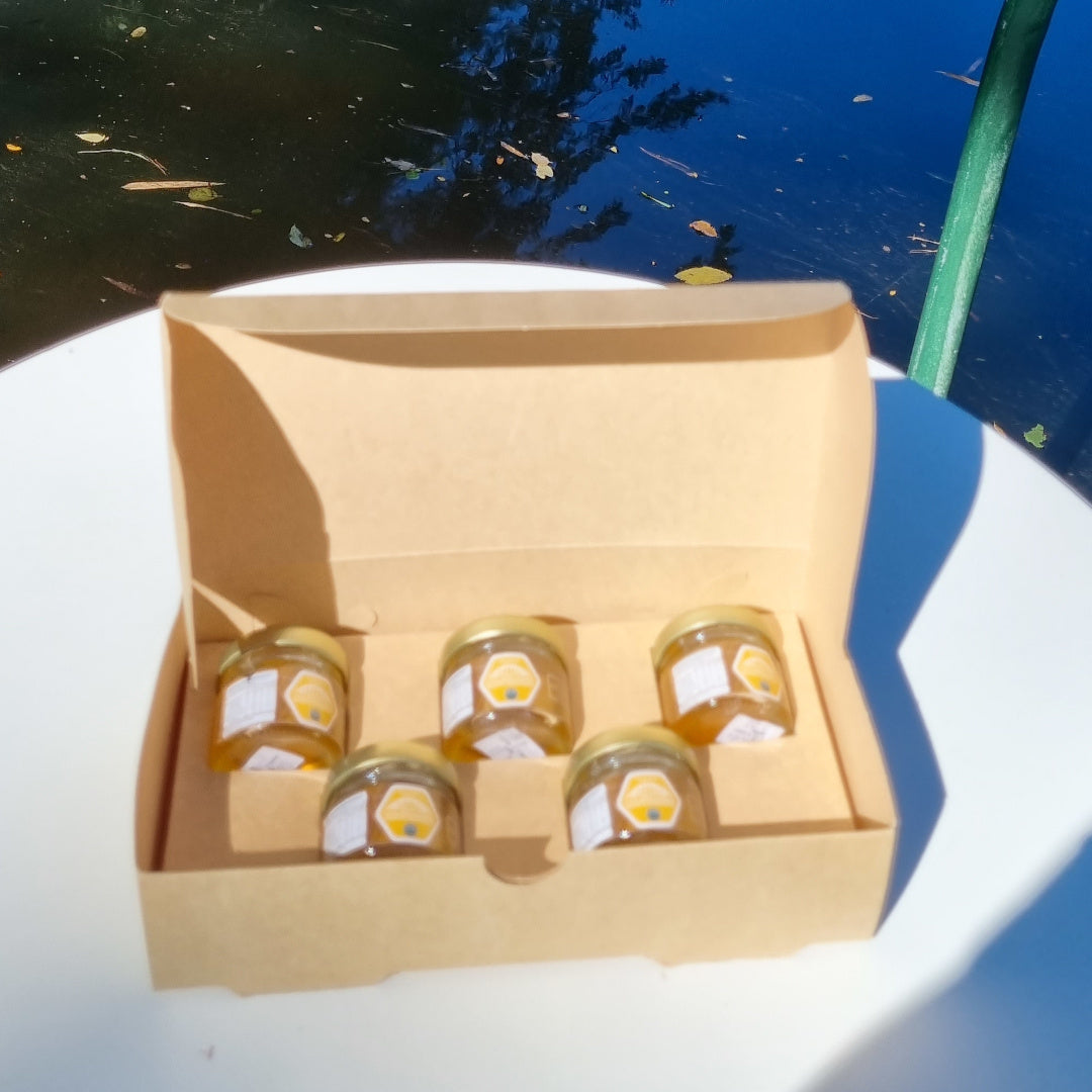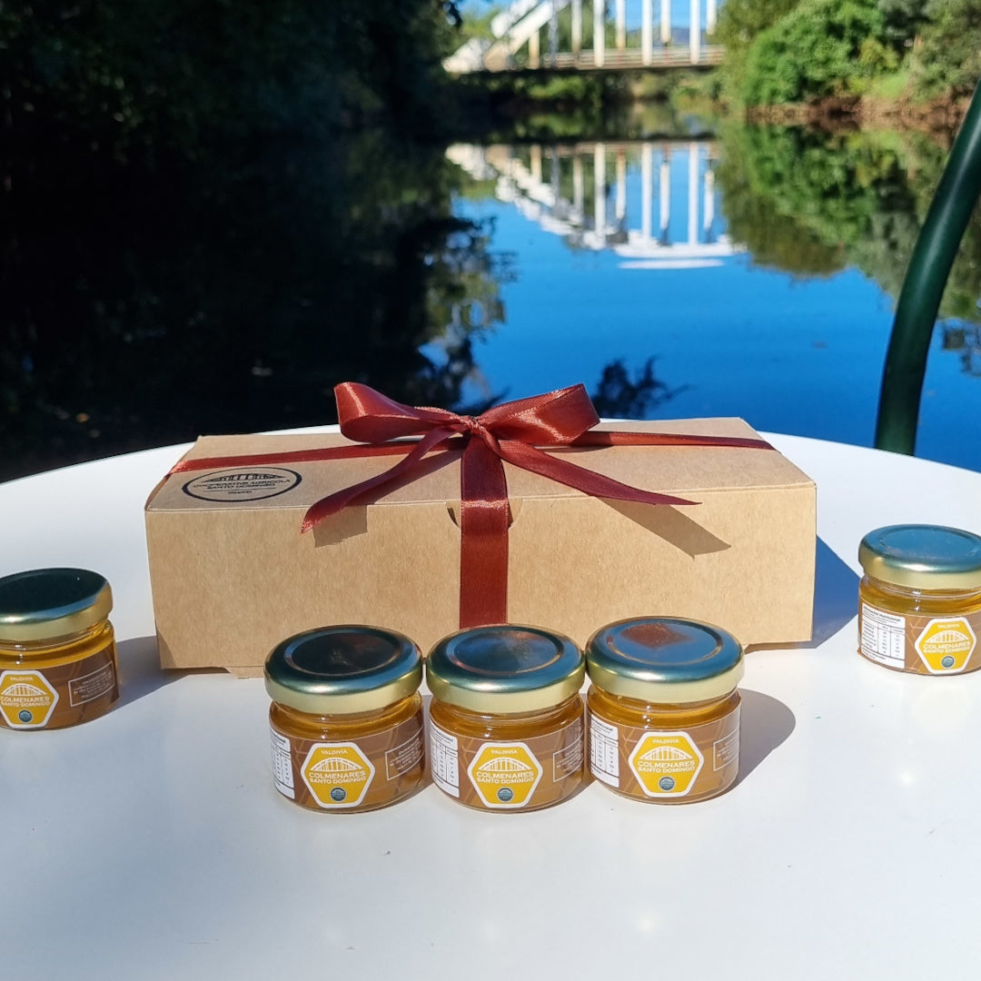 Regala o disfruta una selección única de cinco mieles de 30 g cada una, elaboradas con sabores irresistibles. Desde la intensidad del cacao hasta la frescura de la murta, el toque antioxidante del maqui, la dulzura ácida de los cranberries y la pureza de la miel natural, este pack ofrece una experiencia gourmet para todos los gustos. ¡Perfecto para degustar y compartir!